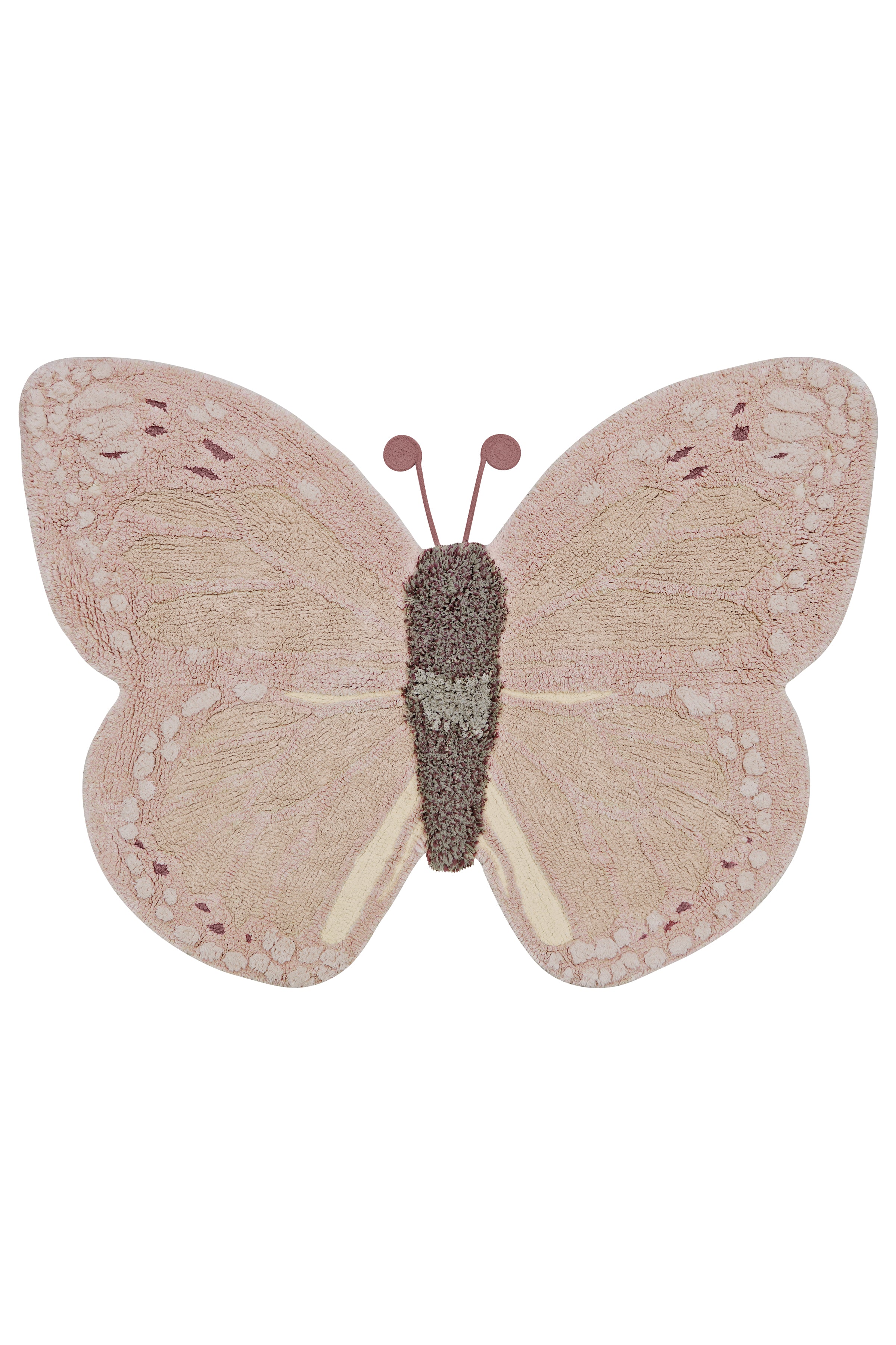 This charming butterfly-shaped rug is handcrafted with soft cotton and is easy to wash at home. It's full of small beautiful details, including a palette of eight different pink shades that blend together to create a realistic butterfly and an antennae carefully handcrafted with cotton cord that can easily be removed from the rug before washing.