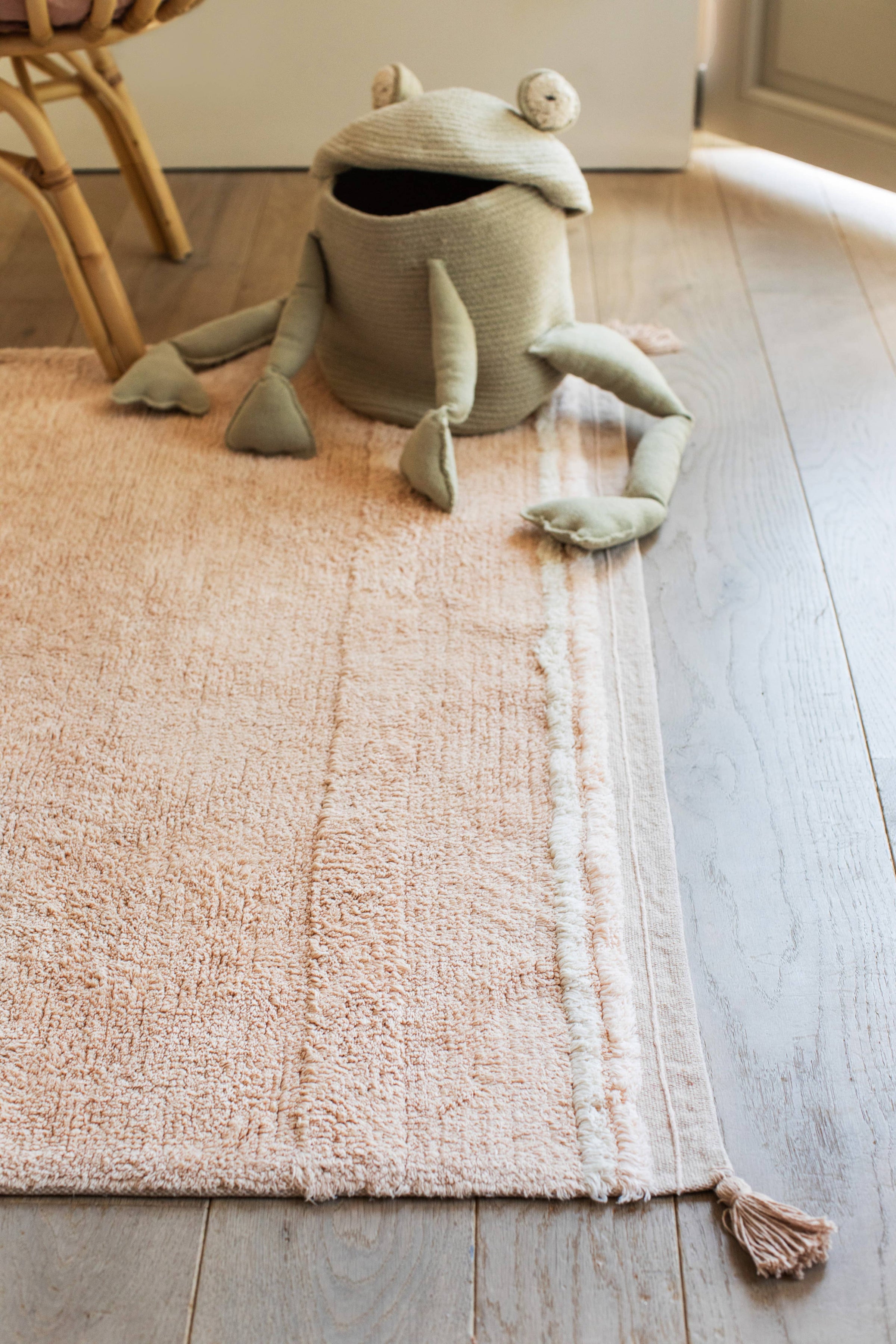 A soft and fluffy rug with with a bohemian vibe. Made with a canvas base woven from RugCycled yarns mixed with undyed natural yarn, this cotton rug in rose combines rows of different pile heights, giving a subtle structure to the surface. Decorated at the borders with two contrasted color lines in nude and natural, followed by a thin embroidered line on top of the bare canvas, the rug is finished with small tassels at the corners.