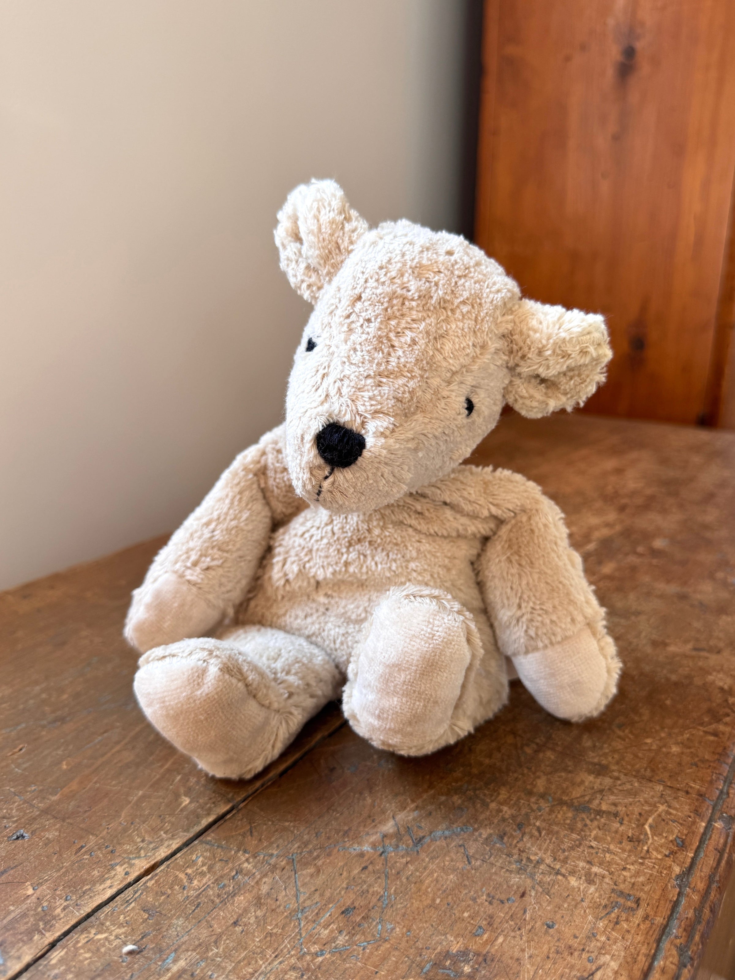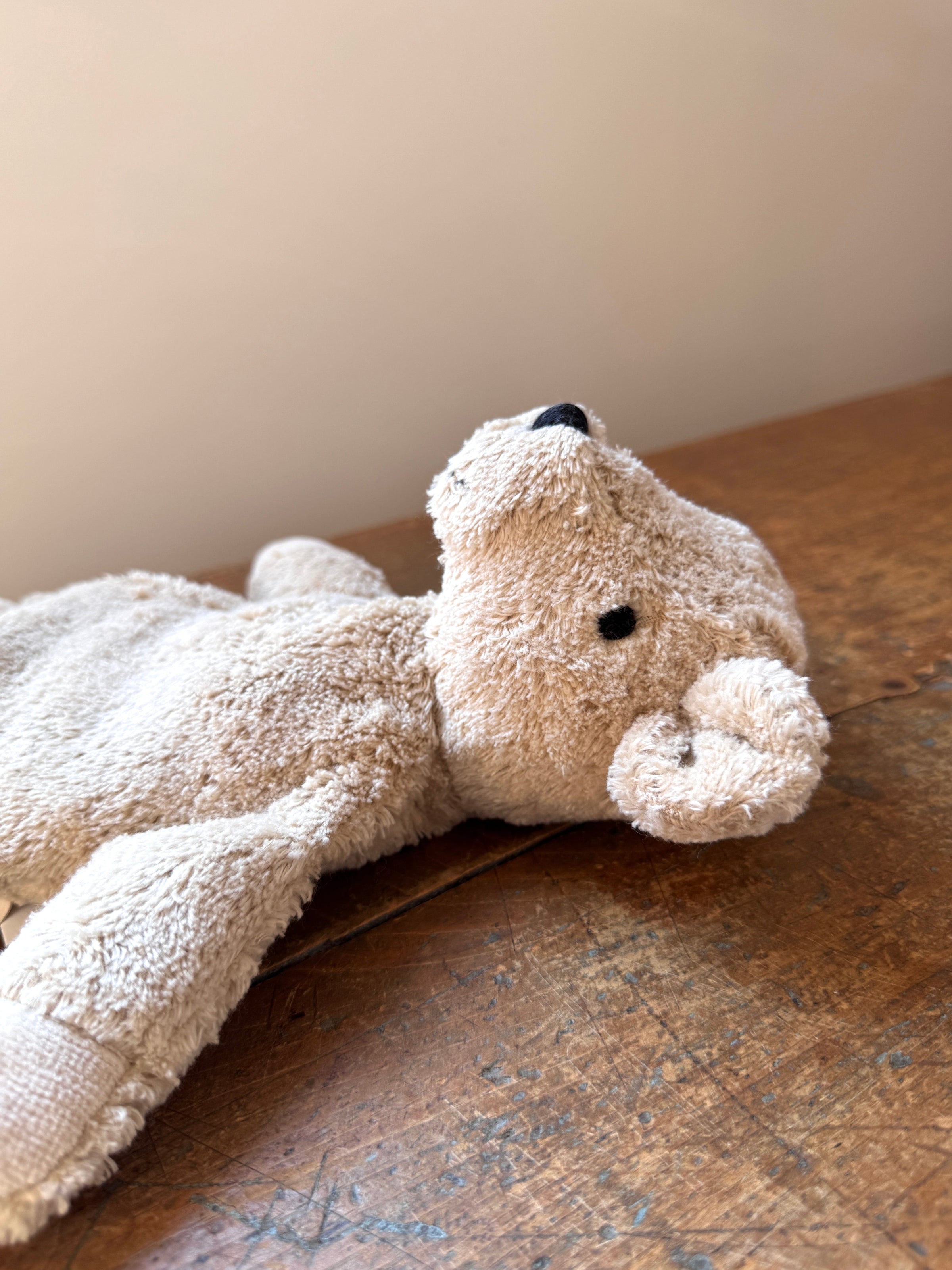 This linen-colored bear is a friend for life--gentle, warm, and full of character. Made from GOTS-certified organic plush cotton and filled with pure new wool, it contains a removable grape seed pillow that can be heated for natural warmth and comfort. A lovingly handcrafted companion.